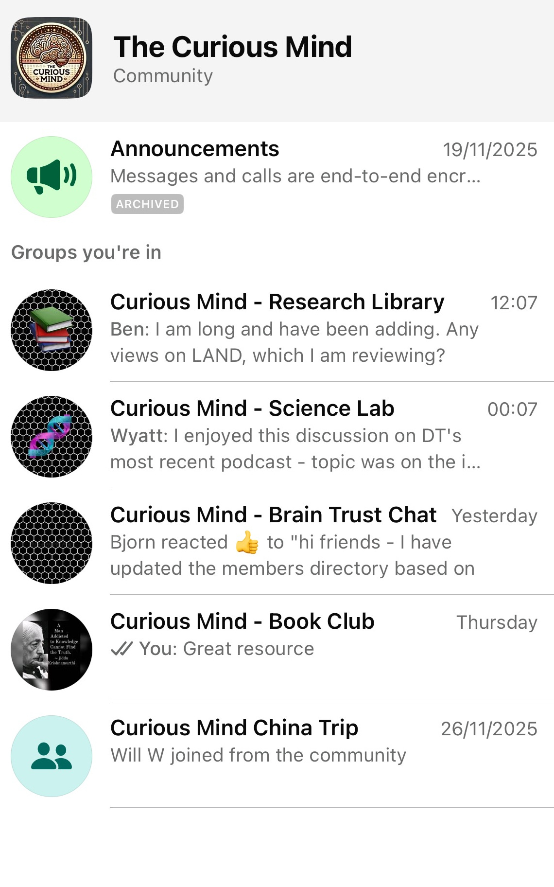 A small number of focused WhatsApp groups covering markets and macro, science and technology, research and reading, book club and trips.