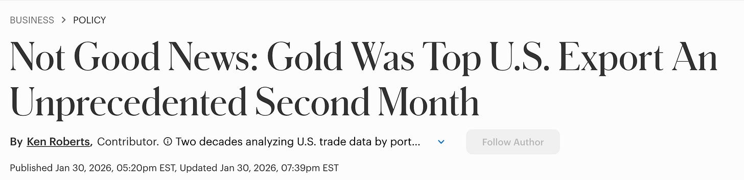 Luke Gromen, the macro researcher, flagged something recently that got me thinking. For two consecutive months, October and November 2025, the single largest American export was non-monetary gold. Not aircraft. Not semiconductors. Not intellectual property. Gold. Shipped in bulk through Switzerland and onward to China and the Gulf states. A Forbes trade editor confirmed it was the first time this had happened in at least twenty years, and probably ever.